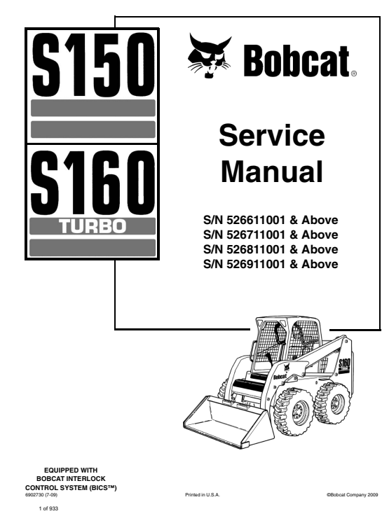 Bobcat S150, S160 Turbo SkidSteer Loader Service Repair Manual