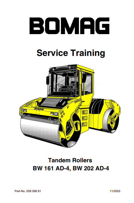 Enhance your operational efficiency with the Bomag BW161-203AD-4-ST-Service Training Manual, a comprehensive guide designed for professionals in the field. This manual provides detailed instructions and insights into the maintenance and service of the Bomag BW161-203AD-4-ST model, ensuring optimal performance and longevity of your equipment. With clear illustrations and step-by-step procedures, it empowers users to troubleshoot issues effectively and perform routine maintenance with confidence, ultimately reducing downtime and increasing productivity on the job site