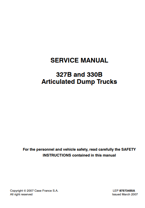 The Case 327B and Case 330B Articulated Dump Trucks Service Repair Manual is an essential resource for any technician or operator looking to maintain and repair these powerful machines with confidence. This comprehensive manual provides detailed instructions, diagrams, and specifications that cover every aspect of the trucks’ operation and maintenance. From troubleshooting common issues to performing complex repairs, this guide ensures that you have the knowledge and tools necessary to keep your equipment running smoothly and efficiently. With clear illustrations and step-by-step procedures, you can easily navigate through the intricacies of the hydraulic systems, engine components, and electrical systems, making it an invaluable addition to your workshop. Invest in this service manual today to enhance your understanding and extend the lifespan of your Case articulated dump trucks