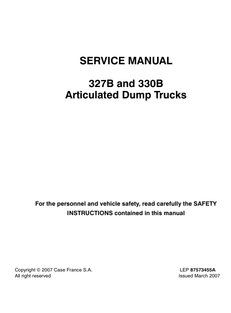 This is the Service Manual for the Case 330B Articulated Dump Truck . This manual is very detailed and contains all the official CASE manufacturer specifications, troubleshooting, repair instructions step by step with illustrations and wiring diagrams. Simple to complicated repairs can be completed effortlessly with the information provided. It is 100 percent complete and intact. The manual is specifically written for the the experienced mechanic