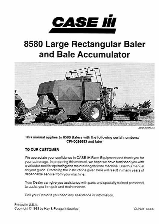 Included Items Operator’s Manual for Case IH 8580 Baler