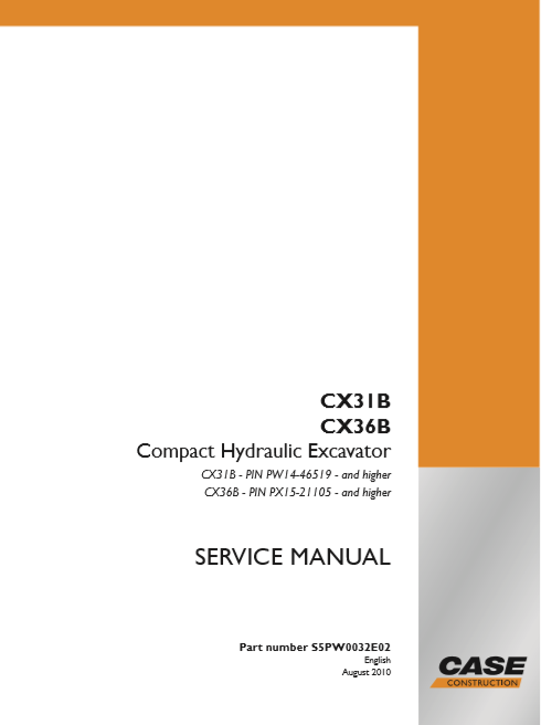 Case CX31B, CX36B Compact Hydraulic Excavator Service Repair Manual