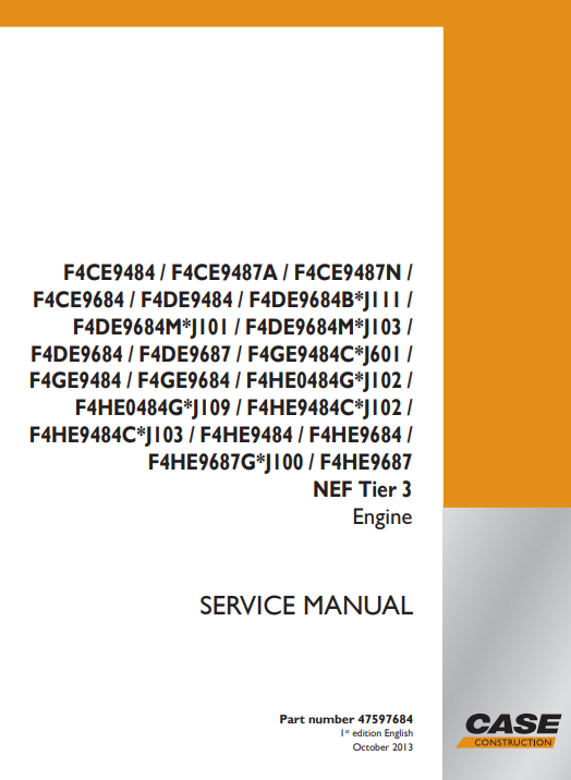 The Case Engine F4CE, F4DE, F4CGE, F4HE Engine Series Service Repair Manual is an essential resource for anyone looking to maintain or repair these powerful engine models. This comprehensive manual provides detailed instructions, diagrams, and specifications that cover every aspect of service and repair, ensuring that you have the knowledge needed to keep your engine running smoothly. With step-by-step guidance on troubleshooting, disassembly, and reassembly, this manual empowers both professionals and DIY enthusiasts to tackle repairs with confidence. Additionally, the clear illustrations and technical data included will help you identify parts and understand the inner workings of your engine, making it an invaluable tool for maximizing performance and longevity. Invest in the Case Engine Service Repair Manual today and ensure your engine operates at its best for years to come