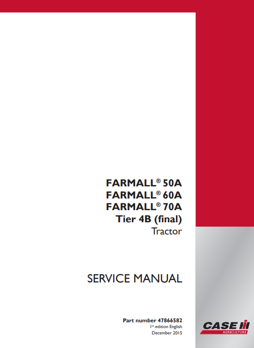 The Case Farmall 50A, Farmall 60A, and Farmall 70A Tier 4B Tractor Service Repair Manual is an essential resource for any owner or operator of these powerful tractors. This comprehensive manual provides detailed instructions on maintenance, troubleshooting, and repair procedures, ensuring that you can keep your equipment running smoothly and efficiently. With clear diagrams, step-by-step guidance, and specifications tailored to each model, this manual empowers you to tackle everything from routine servicing to complex repairs with confidence. Whether you’re a seasoned mechanic or a DIY enthusiast, this service manual is designed to enhance your understanding of the tractor’s systems, helping you to minimize downtime and maximize productivity on your farm. Invest in this invaluable tool to ensure the longevity and performance of your Case Farmall tractors