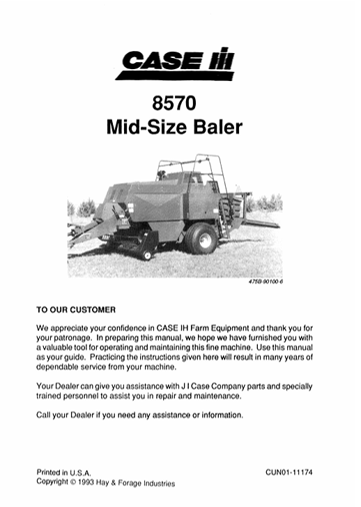 Included Items Operator’s Manual for Case IH 8570 Baler