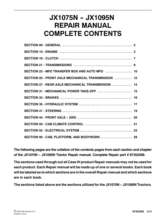 Included Items Complete Service Repair Manual for Case JX1095N Tractor
