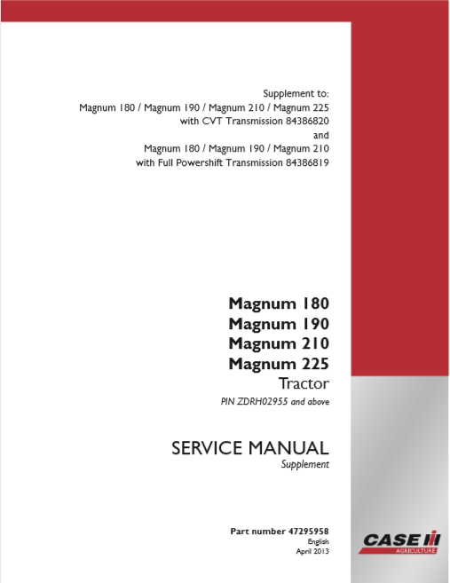Enhance your maintenance capabilities with the Case Magnum 180, 190, 210, 225 Tractors Service Repair Manual (Supplement). This comprehensive guide is designed to provide you with detailed instructions and insights for effective troubleshooting and repair, ensuring your tractors operate at peak performance. With clear diagrams and step-by-step procedures, this manual is an essential resource for both seasoned mechanics and DIY enthusiasts, helping you save time and money on repairs while extending the life of your equipment. Invest in this invaluable tool today and keep your tractors running smoothly for years to come