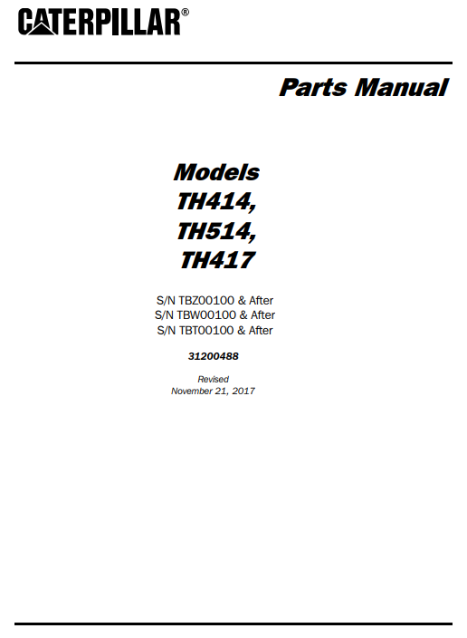 Enhance the performance and longevity of your Caterpillar TH414, TH514, and TH417 telehandlers with our comprehensive Parts Manual. This essential guide provides detailed diagrams, part numbers, and specifications, ensuring you can easily identify and source the right components for maintenance and repairs. With this manual, you can minimize downtime and maximize productivity, making it an invaluable resource for operators and technicians alike. Invest in your equipment’s efficiency and reliability