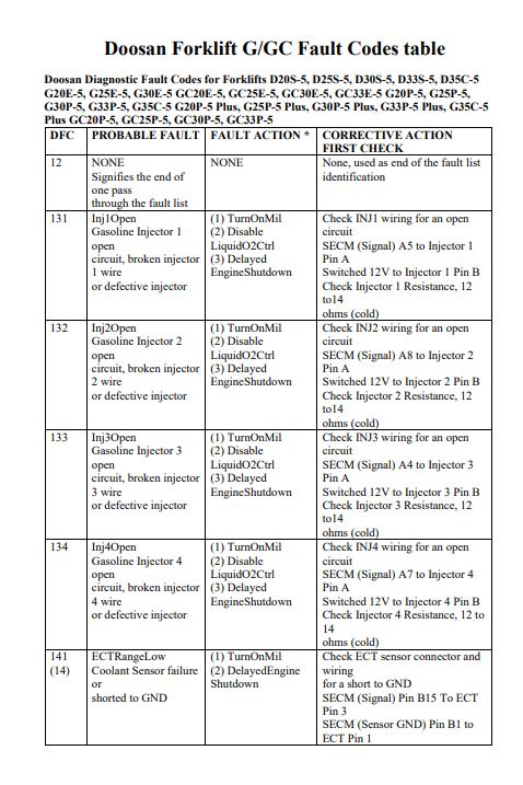 Doosan Diagnostic Fault Codes for Forklifts D20S-5, D25S-5, D30S-5, D33S-5, D35C-5