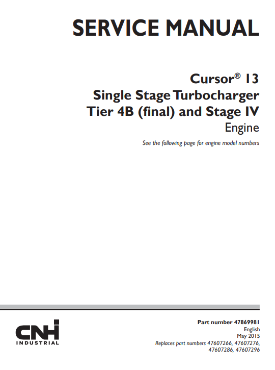 Cursor 13 Single Stage Turbocharger Tier 4B (final) and Stage IV Engine Service Repair Manual