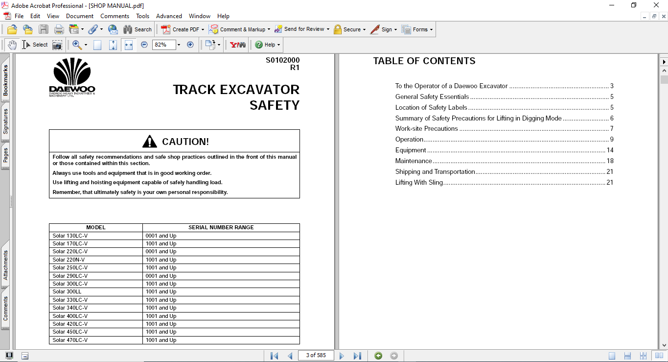 Daewoo Solar 130LC-V to Solar 470LC-V Workshop Manual