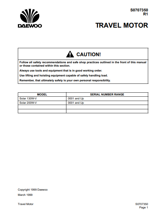 Discover the essential Daewoo Solar 130W-V and 200W-V Travel Motor-Main Pump Repair Manual, designed to empower you with the knowledge needed for effective maintenance and repair. This comprehensive guide provides step-by-step instructions, detailed diagrams, and troubleshooting tips to ensure your solar pump operates at peak performance. Whether you’re a seasoned technician or a DIY enthusiast, this manual is an invaluable resource that enhances your understanding and extends the lifespan of your equipment. Invest in your solar pump’s reliability and efficiency today