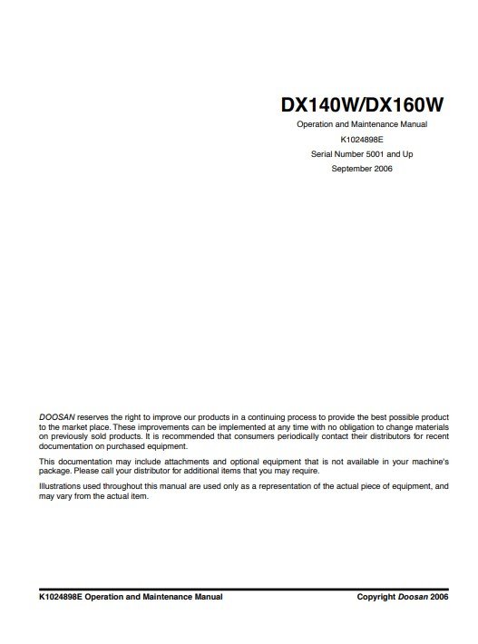 Enhance the performance and longevity of your Doosan DX140W and DX160W excavators with the comprehensive Operation and Maintenance Manual. This essential guide provides detailed instructions on operation, maintenance schedules, and troubleshooting tips, ensuring your machinery runs efficiently and effectively. With clear diagrams and step-by-step procedures, this manual is an invaluable resource for operators and maintenance personnel alike, helping to minimize downtime and maximize productivity on the job site. Invest in your equipment’s reliability and performance today