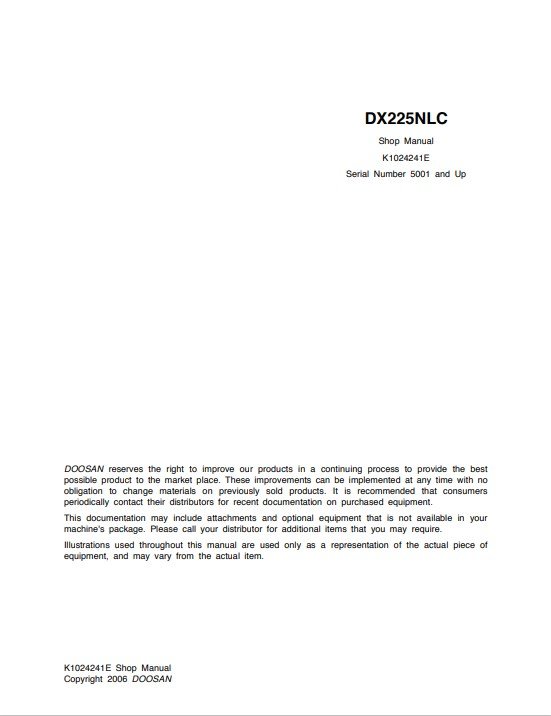 The Doosan DX225NLC Excavator Workshop Repair Manual is an essential resource for any technician or DIY enthusiast looking to maintain or repair their excavator efficiently. This comprehensive manual provides detailed instructions, diagrams, and specifications, ensuring that you have all the information needed to troubleshoot and resolve issues effectively. With its user-friendly layout, you can quickly locate the necessary procedures, saving you time and enhancing your productivity. Invest in this manual to ensure your Doosan DX225NLC operates at peak performance for years to come