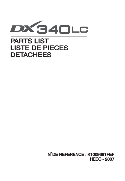 Parts manual for Doosan DX340LC Excavator, showing the cover with an image of the excavator and title detailsDoosan DX340LC Excavator Parts Manual