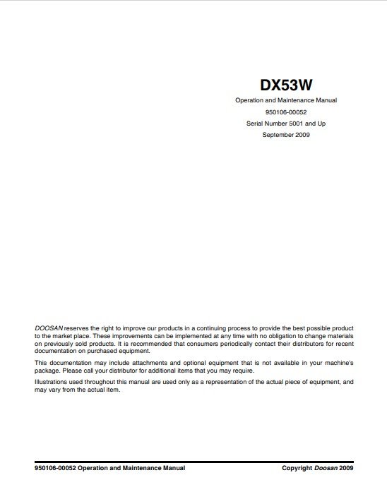 The Doosan DX53W Wheel Excavator Operation and Maintenance Manual is an essential resource for operators and maintenance personnel, providing comprehensive guidance on the efficient operation and upkeep of your excavator. This manual includes detailed instructions, troubleshooting tips, and maintenance schedules to ensure optimal performance and longevity of your equipment. With clear diagrams and easy-to-follow procedures, it empowers users to maximize productivity while minimizing downtime, making it a must-have for anyone looking to maintain their Doosan DX53W in peak condition