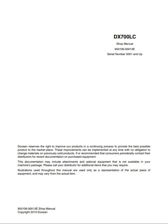 The Doosan DX700LC Excavator Workshop Repair Manual is an essential resource for any technician or DIY enthusiast looking to maintain or repair this powerful machine. This comprehensive manual provides detailed instructions, diagrams, and specifications, ensuring that you have all the information needed to perform repairs efficiently and effectively. With its user-friendly layout, you can easily navigate through troubleshooting tips and maintenance procedures, ultimately extending the life of your excavator and enhancing its performance. Invest in this manual to save time and reduce repair costs while keeping your Doosan DX700LC in peak condition