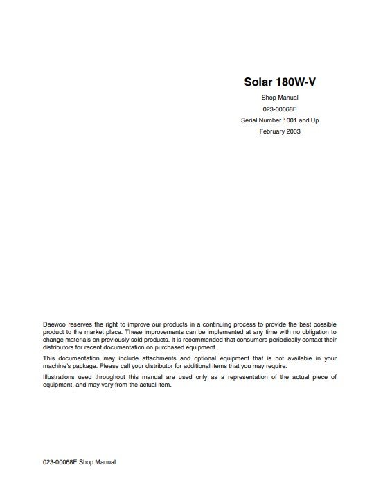 The Doosan S180W-V Excavator Workshop Manual is an essential resource for any technician or operator looking to maintain and repair this powerful machine. This comprehensive manual provides detailed instructions, diagrams, and specifications, ensuring that you have all the information needed to perform routine maintenance and troubleshoot issues effectively. With its user-friendly layout, you can easily navigate through sections to find the exact guidance you need, enhancing your efficiency and prolonging the life of your excavator. Invest in this workshop manual to ensure optimal performance and reliability of your Doosan S180W-V