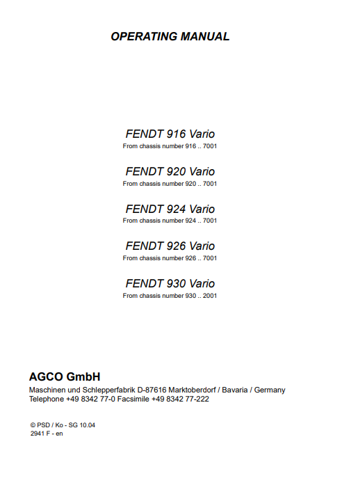 With This Operator’s Manual provide full instruction on how to begin using the machine and its controls of your FENDT Tractor Models of :
