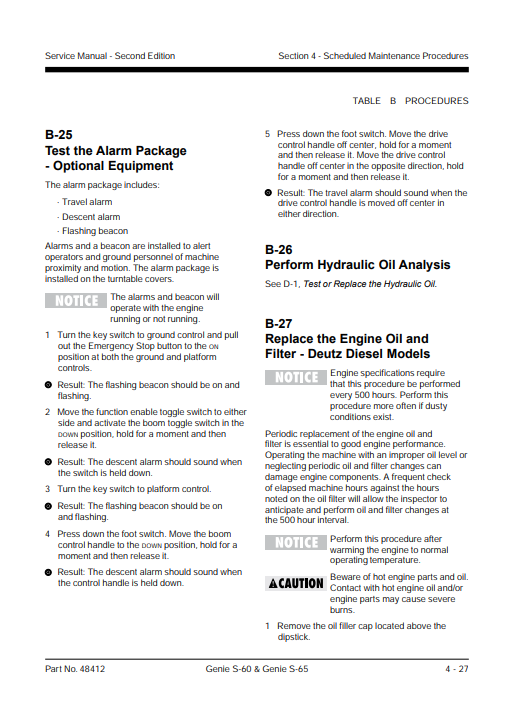 This service manual covers the Genie S-60 and Genie S-65 2WD and 4WD models [Part No. 48412]
