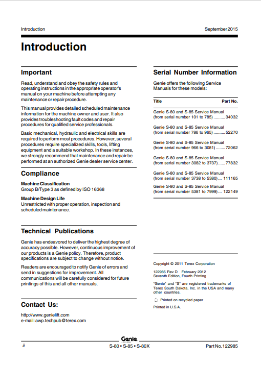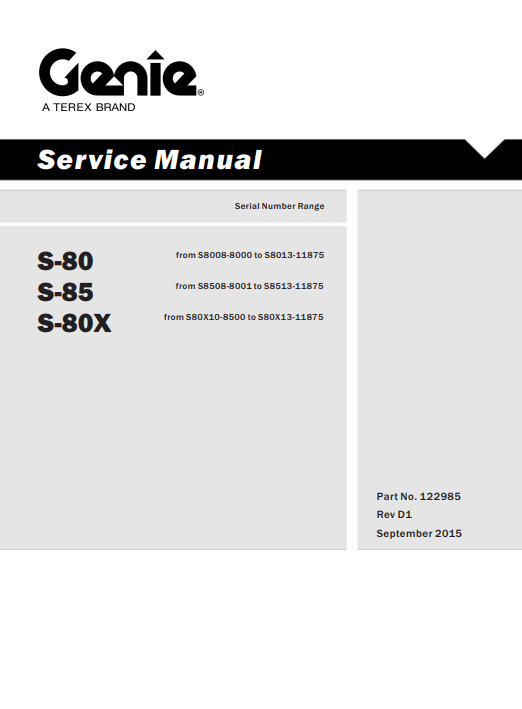 Genie S-80, S-85, S-85X Articulating Boom Lift Service Repair Manual