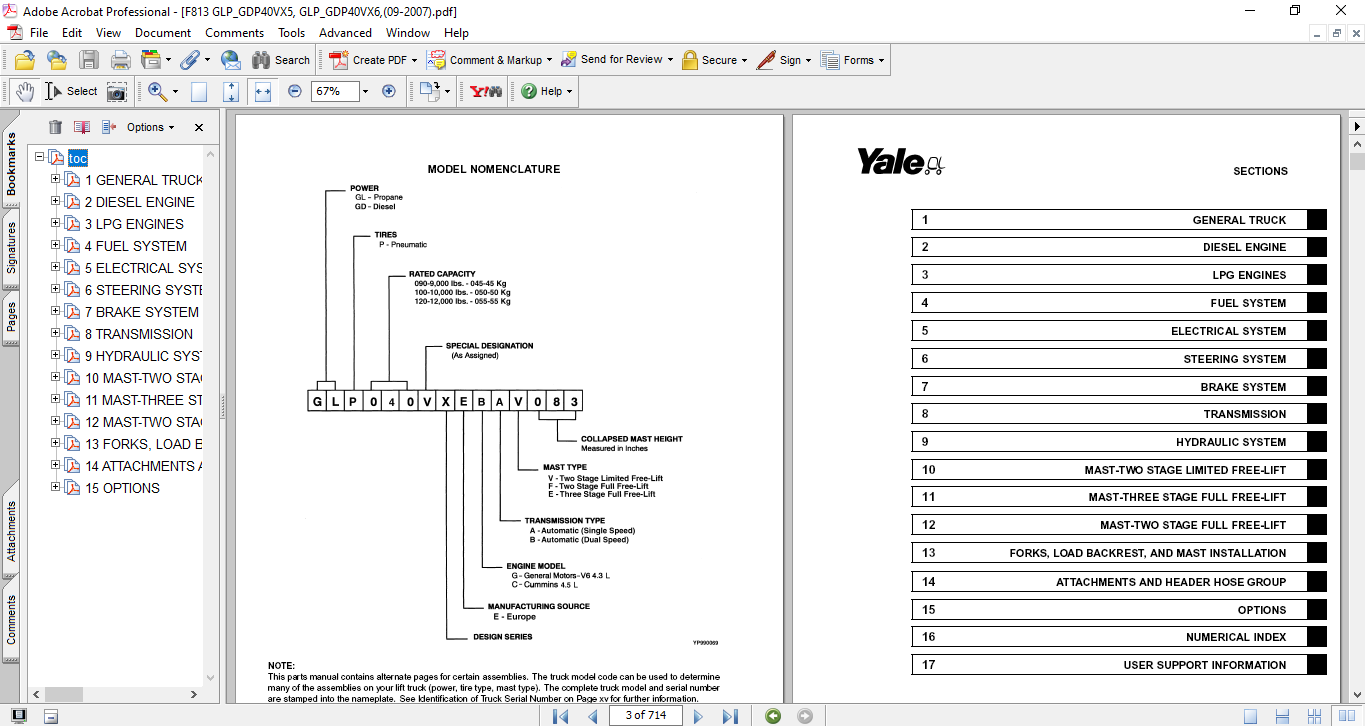 Manual detailing parts for Yale Forklift models GLP/GDP40VX5, GLP/GDP40VX6, GLP/GDP45SVX5, GLP/GDP45VX6, GLP/GDP50-55VXYale Forklift GLP/GDP40VX5, GLP/GDP40VX6,GLP/GDP45SVX5, GLP/GDP45VX6, GLP/GDP50-55VX Parts manual