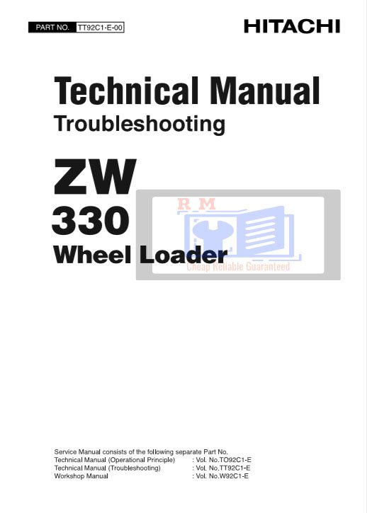 This official Technical and Troubleshooting Manual provides in-depth diagnostic and technical information for the Hitachi ZW330 Wheel Loader. Developed by Hitachi for trained technicians, this manual includes critical systems data, hydraulic flow charts, electrical schematics, troubleshooting procedures, and performance checks necessary for advanced servicing and fault diagnosis.