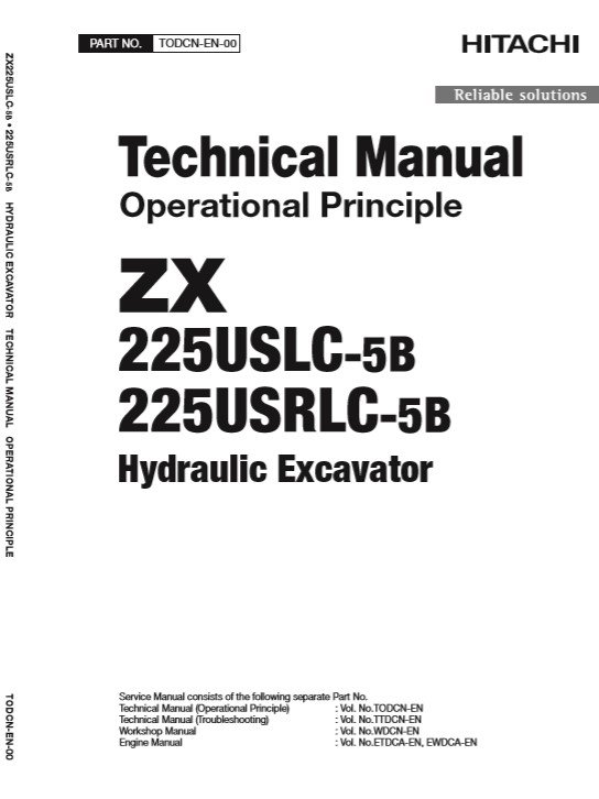 The Hitachi ZX225US-5B and ZX225USLC-5B Technical Manuals are the official OEM resources for advanced troubleshooting, diagnostics, and system testing of these compact radius Zaxis 5B series excavators. These manuals are designed to help technicians and service professionals quickly pinpoint problems, perform accurate system tests, and understand the internal operation of hydraulic, electrical, and electronic systems.