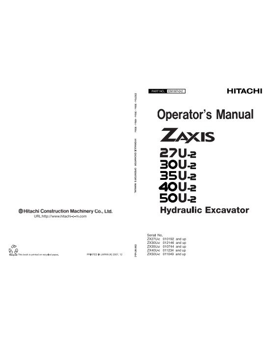 Comprehensive operator's manual for Hitachi ZX27U-2, ZX30U-2, ZX35U-2, ZX40U-2, and ZX50U-2 excavatorsHitachi ZX27U-2, ZX30U-2, ZX35U-2, ZX40U-2, ZX50U-2 Excavator Operator’s Manual