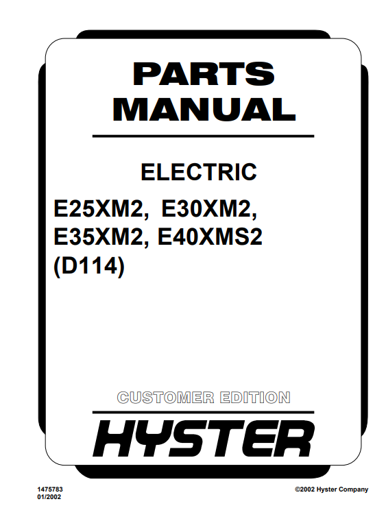 Enhance the performance and longevity of your Hyster E25XM2, E30XM2, E35XM2, and E40XMS2 forklifts with our comprehensive Parts Manual. This essential guide provides detailed diagrams and specifications, ensuring you have the right information at your fingertips for efficient maintenance and repairs. With clear instructions and part numbers, you can easily identify and order the necessary components, minimizing downtime and maximizing productivity. Invest in your equipment’s reliability and keep your operations running smoothly with this indispensable resource