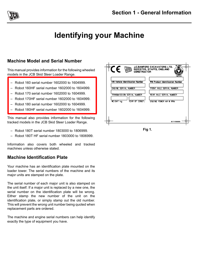 Compatible Serial Number Range JCB Robot 180HF serial number 1602000 to 1604999