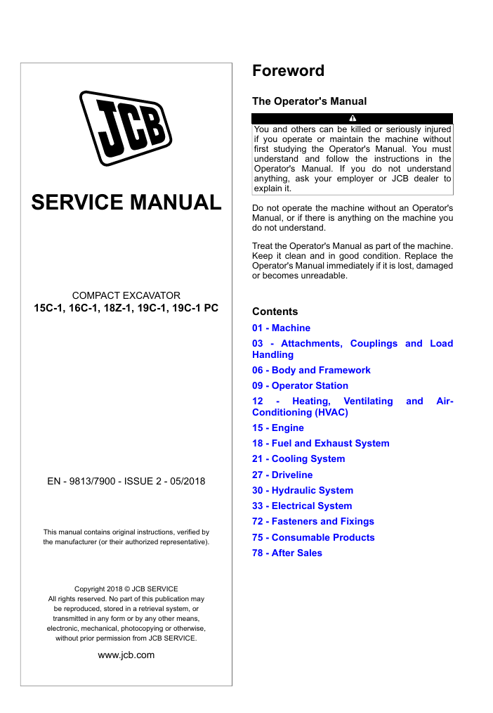 With this original factory Service manual, the technician can detect and solve any problems encountered when repairing your JCB 19C-1 PC Mini Excavator and This workshop repair manual for the JCB 19C-1 PC Mini Excavator provides detailed instructions and technical information for maintenance and repair tasks to keep your equipment in top condition.