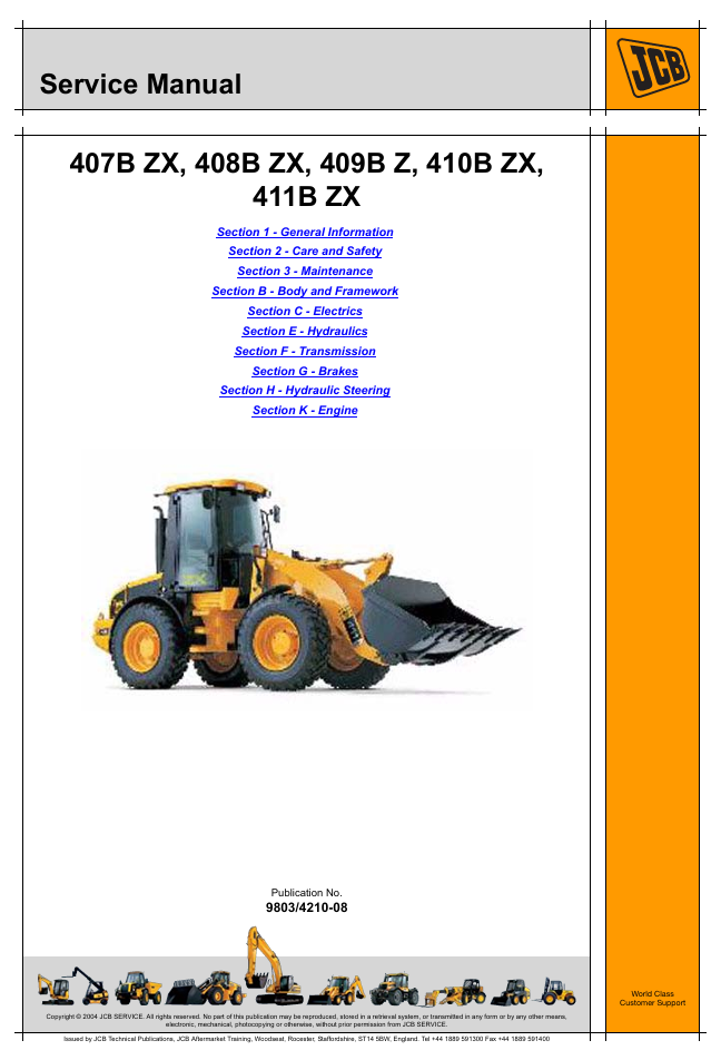 With this original factory Service manual, the technician can detect and solve any problems encountered when repairing your JCB 411B ZX Wheel Loader and This workshop repair manual for the JCB 411B ZX Wheel Loader provides detailed instructions and technical information for maintenance and repair tasks to keep your equipment in top condition.