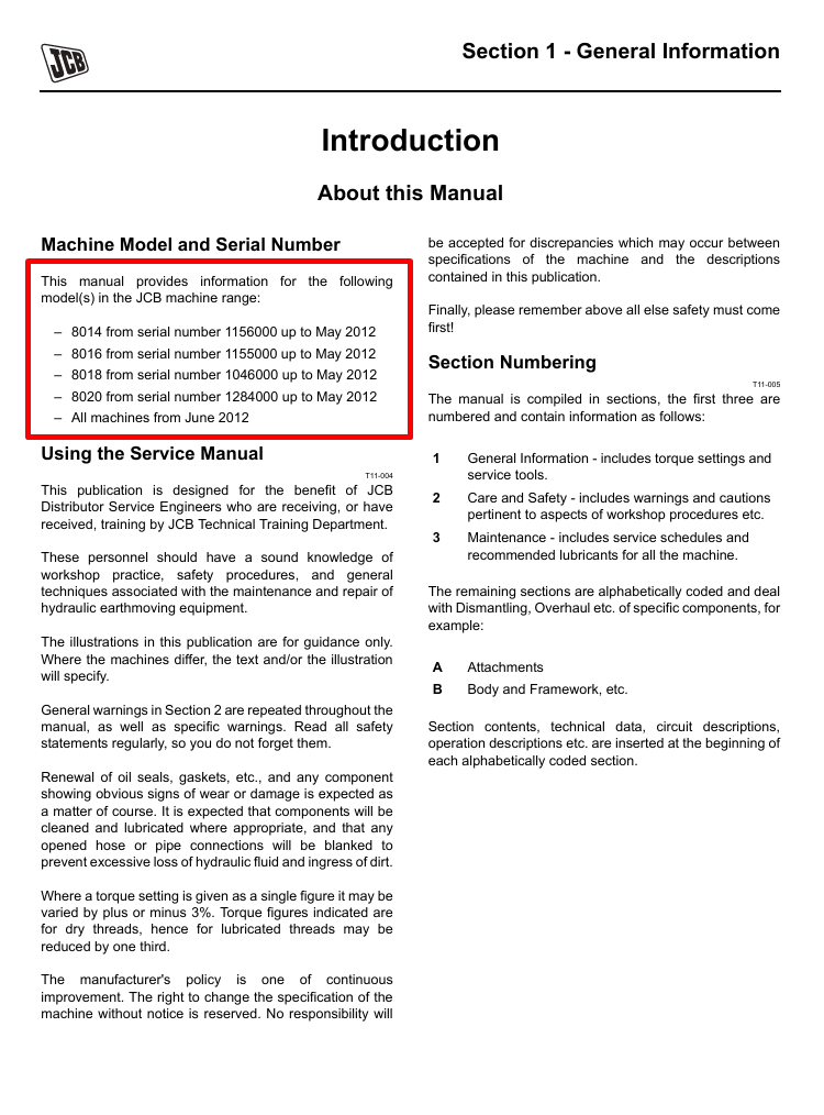 Compatible Serial Number Range JCB 8014 from serial number 1156000 up to May 2012