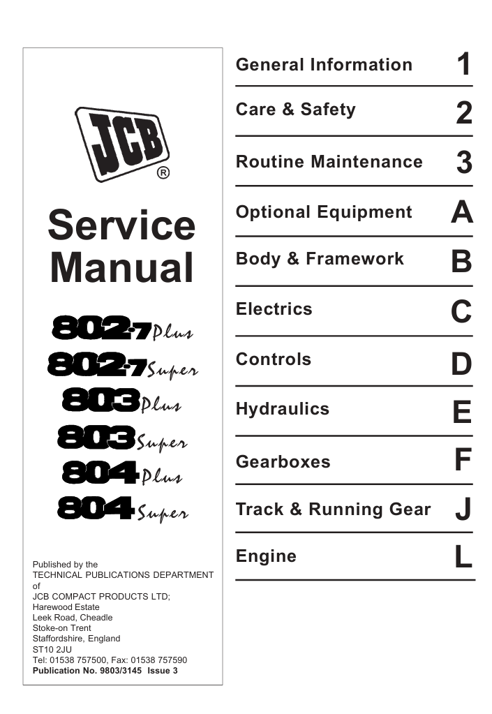 With this original factory Service manual, the technician can detect and solve any problems encountered when repairing your JCB 802.7 Super Excavator and This workshop repair manual for the JCB 802.7 Super Excavator provides detailed instructions and technical information for maintenance and repair tasks to keep your equipment in top condition.