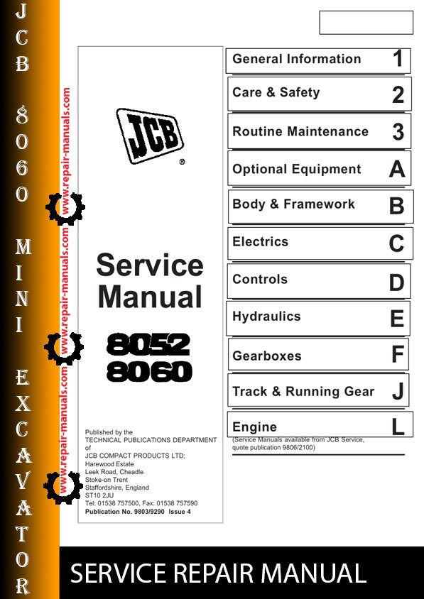 With this original factory workshop manual, the technician can detect and solve any problems encountered when repairing your jcb Excavator and This workshop repair manual for the JCB 8060 Mini Excavator provides detailed instructions and technical information for maintenance and repair tasks to keep your equipment in top condition.