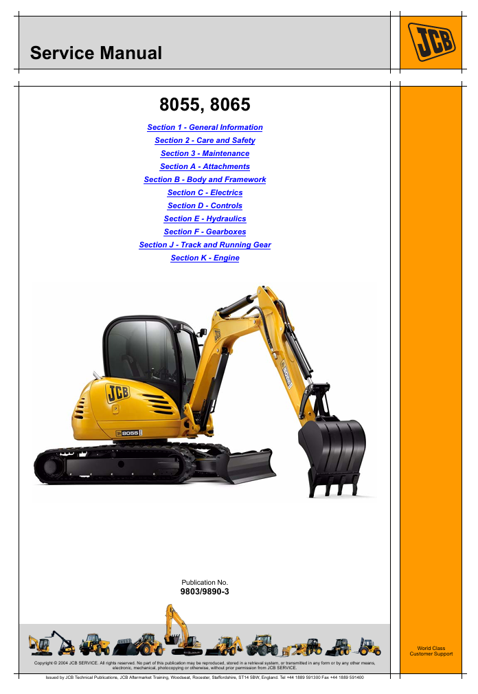 With this original factory Service manual, the technician can detect and solve any problems encountered when repairing your JCB 8065 Mini Excavator and This workshop repair manual for the JCB 8065 Mini Excavator provides detailed instructions and technical information for maintenance and repair tasks to keep your equipment in top condition.