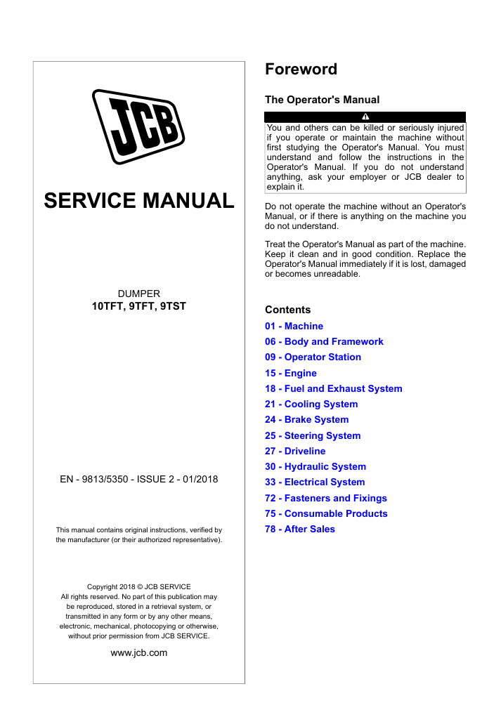 Original Factory Service Repair Manual for the JCB 9TST Dumper. This manual is very detailed and contains all the official JCB manufacturer specifications, troubleshooting, repair instructions step by step with illustrations and wiring diagrams. Simple to complicated repairs can be completed effortlessly with the information provided. It is 100 percent complete and intact. The manual is specifically written for the DIY as well as the experienced mechanic