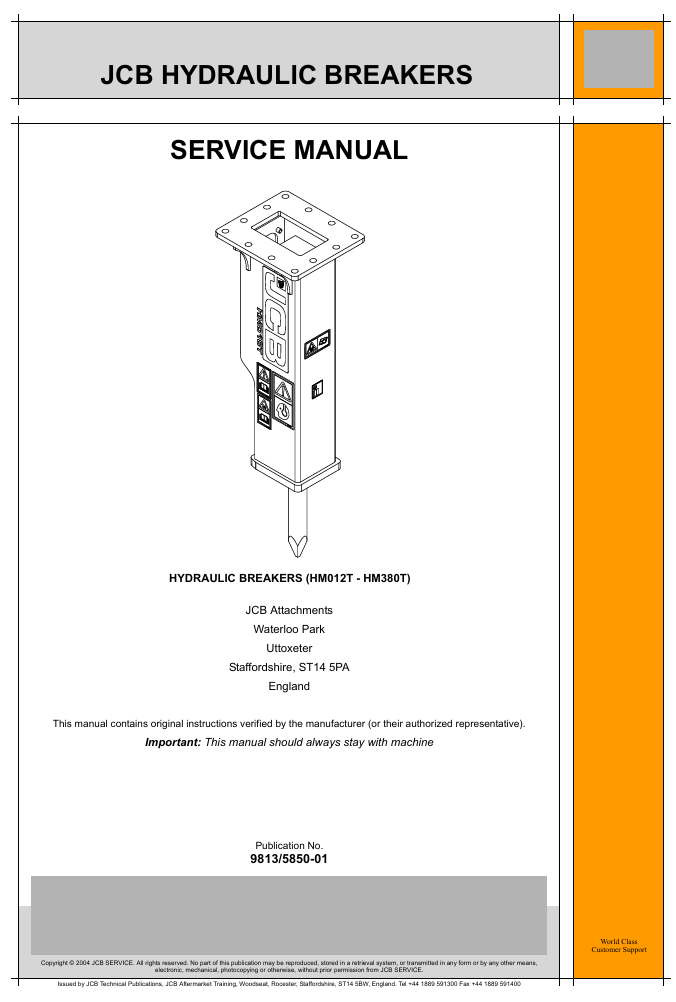 With this original factory Service manual, the technician can detect and solve any problems encountered when repairing your JCB HM380T Hydraulic Breaker and This workshop repair manual for the JCB HM380T Hydraulic Breaker provides detailed instructions and technical information for maintenance and repair tasks to keep your equipment in top condition.