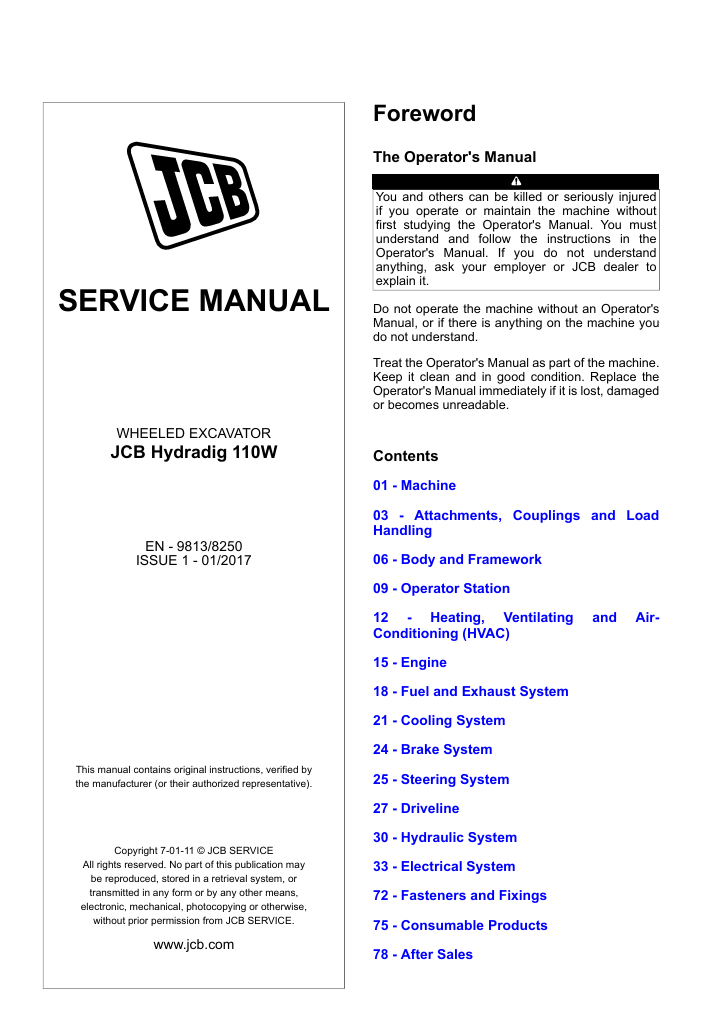 With this original factory Service manual, the technician can detect and solve any problems encountered when repairing your JCB Hydradig 110W Excavator and This workshop repair manual for the JCB Hydradig 110W Excavator provides detailed instructions and technical information for maintenance and repair tasks to keep your equipment in top condition.