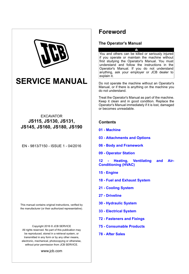 With this original factory Service manual, the technician can detect and solve any problems encountered when repairing your JCB JS 190 Excavator and This workshop repair manual for the JCB JS 190 Excavator provides detailed instructions and technical information for maintenance and repair tasks to keep your equipment in top condition.