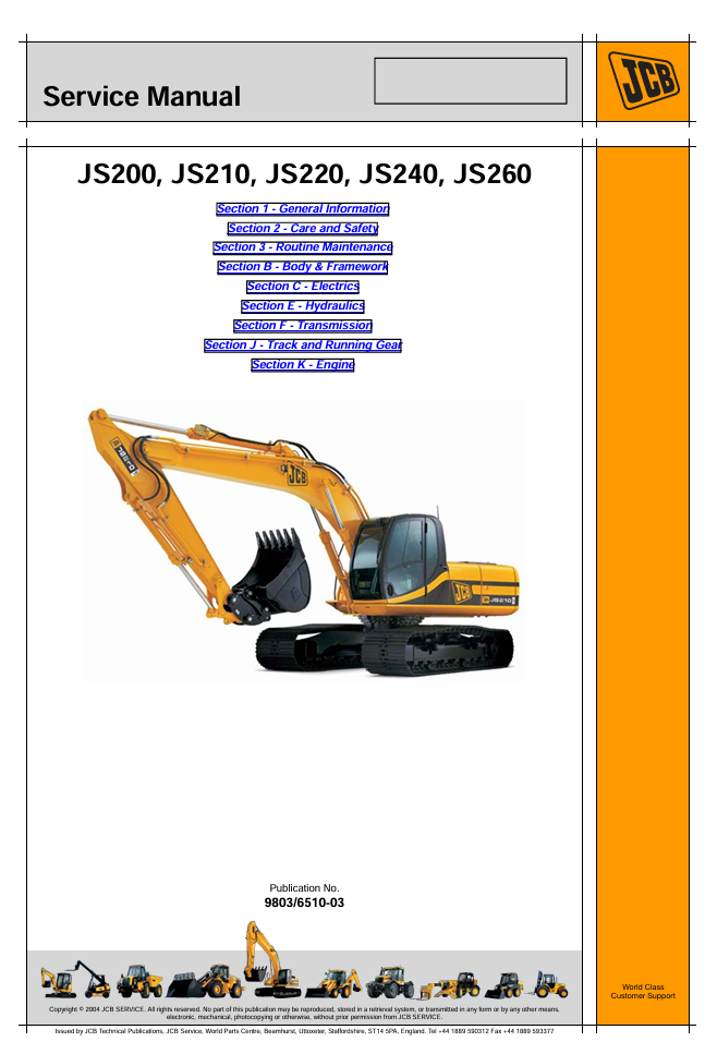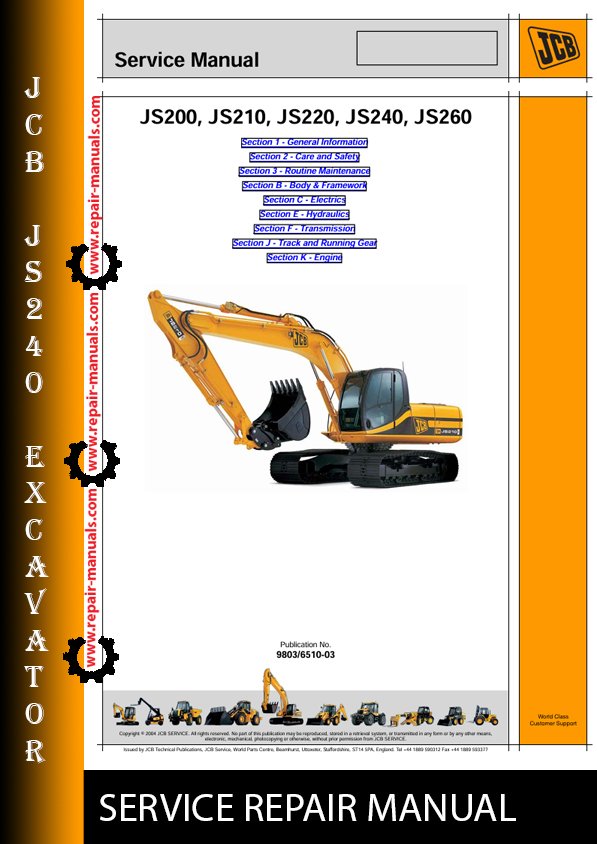 With this original factory workshop manual, the technician can detect and solve any problems encountered when repairing your jcb Excavator and This workshop repair manual for the JS240 Excavators, provides detailed instructions and technical information for maintenance and repair tasks to keep your equipment in top condition.