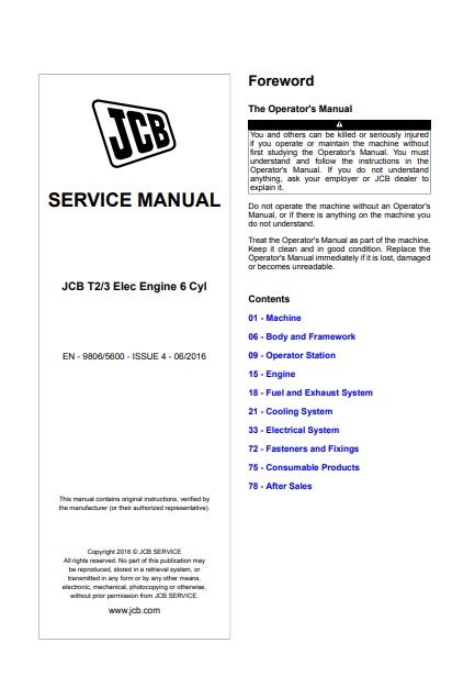 The JCB T2 and T3 Electric Engine 6 Cylinder Service Repair Manual is an essential resource for any technician or DIY enthusiast looking to maintain or repair their JCB machinery. This comprehensive manual provides detailed instructions, diagrams, and troubleshooting tips to ensure efficient servicing of your engine. With clear, step-by-step guidance, you can confidently tackle repairs, reduce downtime, and extend the life of your equipment. Invest in this manual to enhance your technical knowledge and keep your JCB running smoothly