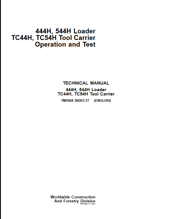 John Deere 444H, 544H , TC44H, TC54H Tool Carrier Operation and Test Technical Manual