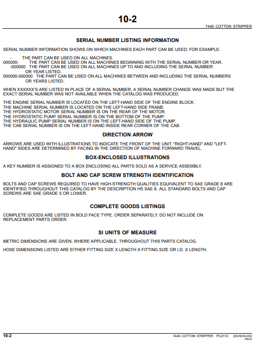 John Deere 7445 Cotton Stripper Parts Catalog