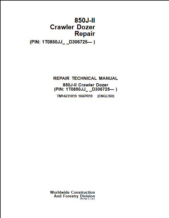 John Deere 850J-II Crawler Dozer Repair Technical Manual