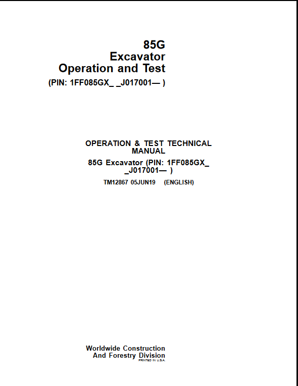John Deere 85G Excavator Operation and Test Manual