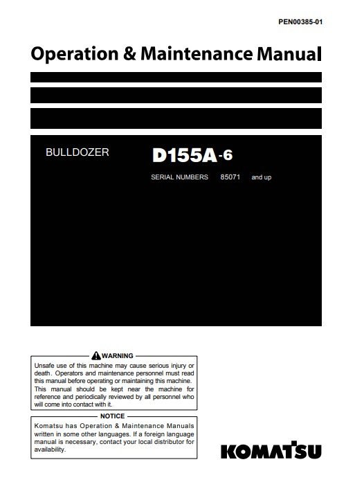 Enhance the longevity and performance of your Komatsu D155A-6 Bulldozer with the comprehensive Operation and Maintenance Manual. This essential guide provides detailed instructions on operation, maintenance schedules, and troubleshooting tips, ensuring your equipment runs smoothly and efficiently. With clear diagrams and expert insights, this manual is an invaluable resource for operators and maintenance personnel alike, helping to minimize downtime and maximize productivity on the job site. Invest in your machinery’s upkeep and ensure optimal performance with this indispensable manual