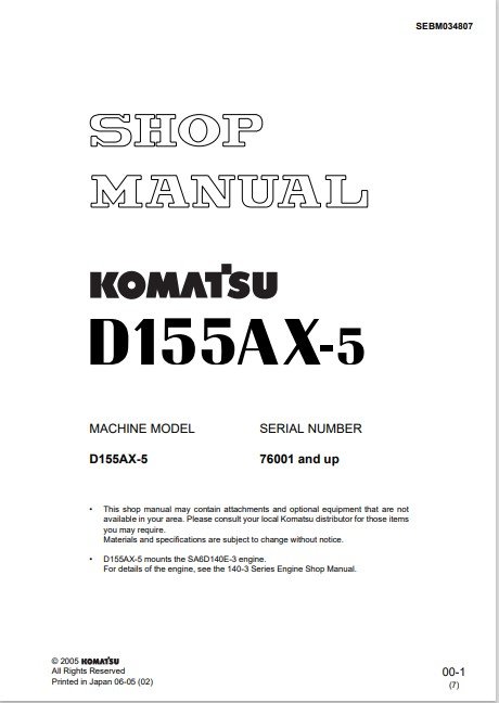 The Komatsu D155AX-5 Bulldozer Workshop Manual is an essential resource for operators and technicians, providing comprehensive guidance on maintenance, troubleshooting, and repair procedures. This manual is meticulously designed to enhance the performance and longevity of your bulldozer, featuring detailed diagrams, specifications, and step-by-step instructions. With this manual at your fingertips, you can ensure optimal operation and minimize downtime, making it a valuable investment for any heavy machinery professional