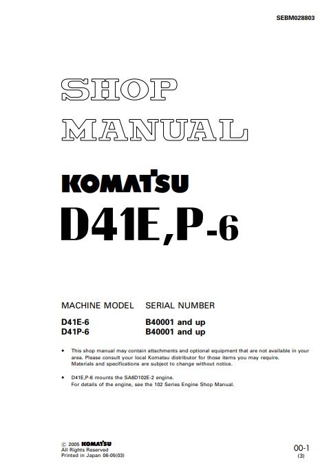 The Komatsu D41E-6 and D41P-6 Bulldozer Workshop Manual is an essential resource for operators and technicians, providing comprehensive guidance on maintenance, troubleshooting, and repair procedures. This manual is meticulously designed to enhance the performance and longevity of your bulldozer, ensuring that you can tackle any job with confidence. With detailed diagrams, step-by-step instructions, and expert tips, this workshop manual empowers you to keep your equipment running smoothly and efficiently, making it a must-have for any serious operator